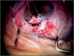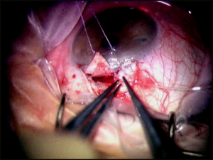 Creation of a scleral lake is accomplished by excisioning the deep scleral flap followed by watertight closure of the superficial scleral flap with interrupted 10-0 nylon sutures. The conjunctiva and Tenon’s capsule is reapproximated with 8-0 Vicryl at the limbus, and finally subconjunctival antibiotics are given along with topical antiobiotic-steroid ointment.