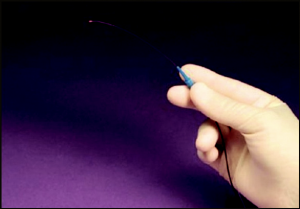 Canaloplasty is accomplished by exposing Schlemm’s canal via non-penetrating dissection and using the iTrack 250 flexible microcatheter (Figure 40 -1) to circumferentially viscodilate and intubate Schlemm’s canal with a tensioning suture. Furthermore, the microcatheter is also unique in that it has a beacon tip to allow for transscleral illumination during catheterization.