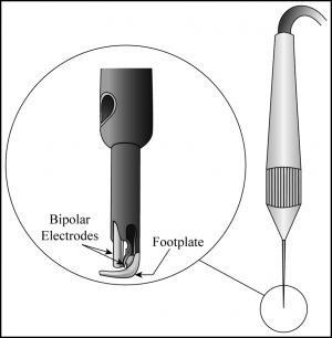 The Trabectome utilizes gravity-driven infusion and automated aspiration. The handpiece consists of a 19.5-gauge infusion sleeve handle, a 25-gauge aspiration port, and coupling for the ablation unit at the tip. The 25-gauge shaft is 5 mm longer than the infusion sleeve and this distal end terminates in a footplate (Figure 16-1).[3][4] This footplate facilitates penetration into Schlemm’s canal and insulating material over its surface helps protect the canal’s outer wall. The meridional diameter of the footplate varies between 350 and 500 µm.