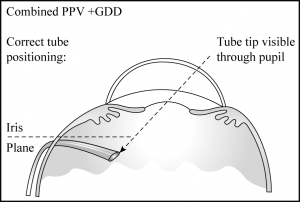 Typically, glaucoma drainage devices (GDDs) and pars plana vitrectomy (PPV) are combined when the drainage tube needs to be placed through the pars plana. Although there are multiple reasons why a tube would be placed through the pars plana instead of the anterior segment, there are roughly 3 broad categories: to protect compromised corneal endothelium, the anterior segment will not anatomically accept a tube, or perilimbal conjunctival thinning or scarring. Additionally, if a vitrectomy and a GDD are both required (ie, neovascular glaucoma with nonclearing vitreous haemorrhage), combining a PPV and GDD may be more convenient and lead to a better outcome than performing the surgeries separately.