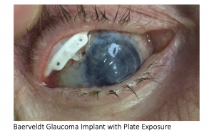 Late erosion of the plate (figure 4) is uncommon but cannot be repaired. Direct suturing of the conjunctiva or covering the plate with graft material almost always fails. In these cases, the exposed device should be removed. If necessary, another tube can be placed in a different quadrant, or ciliary body ablation can be performed.