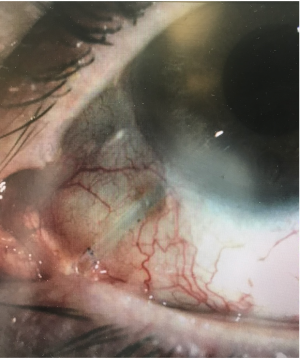 Erosion of the tissues overlying the tube (figure 3) usually occurs months to years after tube placement, although occasionally it can occur earlier. It is typically seen approximately 2 to 4 mm posterior to the limbus, presumably due to pressure and rubbing from the upper lid tarsus. Tube exposure needs to be repaired because it can lead to endophthalmitis and even orbital cellulitis. Although a patient may be temporized with topical antibiotics, management of tube exposures is purely surgical.