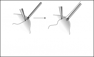 If there is still no evidence of tube function, the obstruction is more likely due to fibrous growth into the valve or tight encapsulation overlying the valve outlet. I have found success in these situations by cutting away the capsule overlying the plate (only in valved devices, otherwise profound hypotony will Tube tip delivered from eye, 3-0 prolene run up tube and grasped with forceps to mark maximum point of insertion.