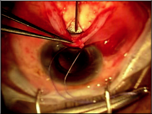 In this technique, an 8-0 Vicryl suture is then used to complete a double-layered running closure of the Tenon’s capsule and conjunctiva. It is important to assure that this wound is watertight at the end of the surgery with an appropriately formed anterior chamber and IOP.