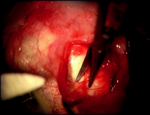 This combined procedure typically begins with creation of a fornix-based flap in the superotemporal or inferonasal quadrants[9] for placement of the glaucoma drainage device of choice (Baerveldt, Ahmed, Molteno, etc.). The plate of the glaucoma drainage device is then secured to the scleral bed 9 to 10 mm behind the limbus using 2 interrupted sutures. If a Baerveldt implant is used, the shunt is then ligated with an additional suture around the tube, and fenestrations are made in the tube using the suture needle.