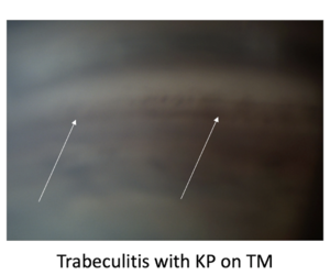 The typical patient is 20-50 years old with complaints of mild ocular discomfort and blurring of vision. Examination reveals a mild inflammatory reaction in the anterior chamber with inferiorly distributed fine keratic precipitates (KP) and elevated IOP (up to 70 mmHg). Blurring of the vision and halos occur when corneal edema is present secondary to elevated IOP. The iris may become ischemic due to extreme IOP elevation and the pupil may be mid dilated. The conjunctival is often unremarkable. Gonioscopy reveals normal angle anatomy except for sparce inflammatory debris. KP are also identified over the trabecular meshwork (Figure 1) on gonioscopic examination. The patient may recall other similar episodes that are short lasting and may be separated by months or years, which adds to the diagnostic difficulty given the low likelihood of patients remembering episodes that occurred in the distant past. The optic nerve remains normal early in the course of the disease, but optic nerve cupping and visual field defects arise after multiple attacks. Examination of the anterior chamber and IOP between attacks are unremarkable often leading to confusion and delayed diagnosis.