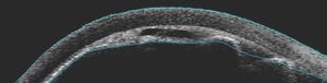 Patients often present with a red painful eye and decrease in vision. There is a higher incidence of malignant glaucoma in hyperopic eyes (short axial length). The intraocular pressure (IOP) is often very elevated but may present with “normal” or lower pressures leading to confusion about the diagnosis. Key to diagnosis is a flat chamber with both iris and lens positioned anteriorly and an almost flat anterior chamber (figure 1). The cornea shows signs of edema from both the elevated IOP as well as iris and lens touch. This should be distinguished from any post-operative swelling of the cornea. The opposite eye central anterior chamber is typically deep and this is one clue to distinguish malignant glaucoma from acute primary angle closure where the anterior chambers of both eyes are more symmetric. Ultrasound biomicroscopy can be useful in identifying anatomical structures when the corneal edema hinders slit lamp examination (figure 2). Optically clear “aqueous zones” have been described in the vitreous cavity although I have not seen this in my experience. History of intraocular surgery and laser should be explored including pars plana vitrectomy, trabeculectomy and the lasers mentioned earlier. Starting or stopping both cycloplegics as well as miotics have also been connected to the development of malignant glaucoma and should be part of the clinical history taking when possible.