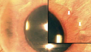 As vessels proliferate in the angle, arborizing over the ciliary body and scleral spur and spreading over the trabecular meshwork (TM), progressive elevation in IOP can be noted related to a decrease in outflow facility. NVA typically occurs first at the base of the iris taking the form of individual vascular trunks that cross the ciliary body and scleral spur and over the corneoscleral TM. The vessels then form fine networks of branching connections that become intertwined with branches from other vascular trunks. Eventually, a fibrovascular membrane forms that is contractile and produces localized anterior synechiae (which do not reach beyond Schwalbe’s line as can be seen in ICE Syndrome) with progressive zipping of the angle as the disease progresses. The elevation of IOP at these later stages can occur acutely with extremely high applanation values and red painful eyes.