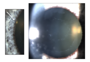 On examination, you can see all of the deposits mentioned above including fibrillar material on the lens capsule and drainage angle. The capsule manifestation is classically described as a bulls eye pattern which you can see in the photo (Figure 1). The bulls eye pattern is created by the iris chaffing away material in the deposit free zone each time the pupil dilates and constricts. Zonular laxity often results in phacodenesis. For the new residents out there, phacodenesis is when you see the lens move as the patient looks from side to side or if you bump the slit lamp and see the lens shake. The video shows a pseudoexfoliation cataract post femto rhexis and lens segmentation and the perilimbal heme from the femto suction docking system. The eye is exhibiting micromovements of the lens as the eye moves from side to side. The surgeon chose to use the femto laser in order to use as little pressure as possible in an eye with compromised zonules. This must be noted prior to cataract surgery so you can plan accordingly for a safe extraction of the lens as it is better to plan ahead for all the possibilities. More on this in a bit. The zonular laxity can also lead to shifting of the lens anteriorly with narrowing of the angle and potential angle closure. I’ve only seen this a handful of times in my career but it is more common in other areas where PXF is more prevalent.