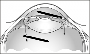 Rarely, aqueous misdirection can persist despite a complete pars plana vitrectomy, presumably due in part to the presence of the retained vitreous skirt. In these cases, an iridozonulohyaloidectomy (IZH; this term was coined by Ike Ahmed, MD) should be performed (Figure 5-1). This can be done by passing an automated vitrector from the posterior segment, up through the zonules and iris, into the anterior chamber (or similarly from the anterior chamber down through iris and zonules into the anterior vitreous). A combined pars plana vitrectomy and IZH are highly curative but can be performed only in pseduophakes or aphakes. In phakic patients, the lens may need to be removed to allow resolution of aqueous misdirection.[6]
