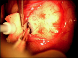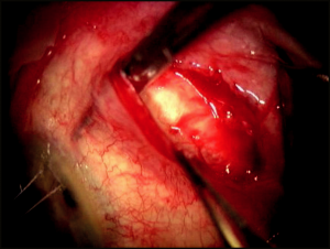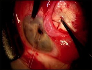 It is necessary to make the initial conjunctival incision parallel to the eyelid margin, a minimum of 8 mm posteriorly. The Tenon’s fascia, in turn, is grasped and incised until the episclera is visualized. The conjunctival– Tenon’s wound should be lengthened to approximately 2 clock hours. The conjunctiva and Tenon’s tissue should only be incised when in the grasp of forceps and while they are raised over the episclera to avoid incorporating a rectus muscle with these tissues.