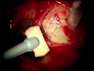 Because MMC can be highly toxic to the corneal endothelium and tissues of the anterior segment,[11][12] it should be applied in a controlled manner to bare sclera prior to entering the eye. A cellulose or cut end of a Weck-Cel sponge saturated with MMC is applied to bare sclera. We recommend diffuse application of multiple MMC sponges, under all areas of Tenon’s fascia, to decrease the incidence of high avascular localized blebs and to promote low diffuse filtering blebs. After the exposure period, the sponge is removed and the surgical site is thoroughly irrigated with a full container (15 mL) of balanced salt solution.